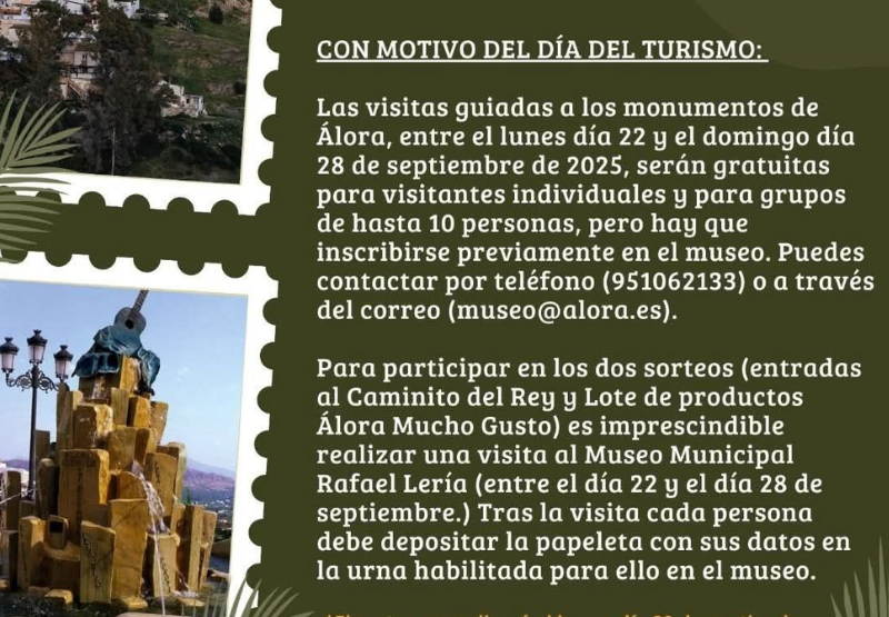 A su vez, esta iniciativa viene acompañada de dos sorteos: uno de ellos donde se regalan 4 entradas del Caminito del Rey, además de un pack de productos de la marca “Álora Mucho Gusto”, valorado en 50 €. Para participar, será imprescindible realizar una visita al Museo Municipal Rafael Lería y, al finalizar, depositar la papeleta en una urna habilitada en este espacio. La celebración de los sorteos tendrá lugar el lunes, 29 de septiembre.